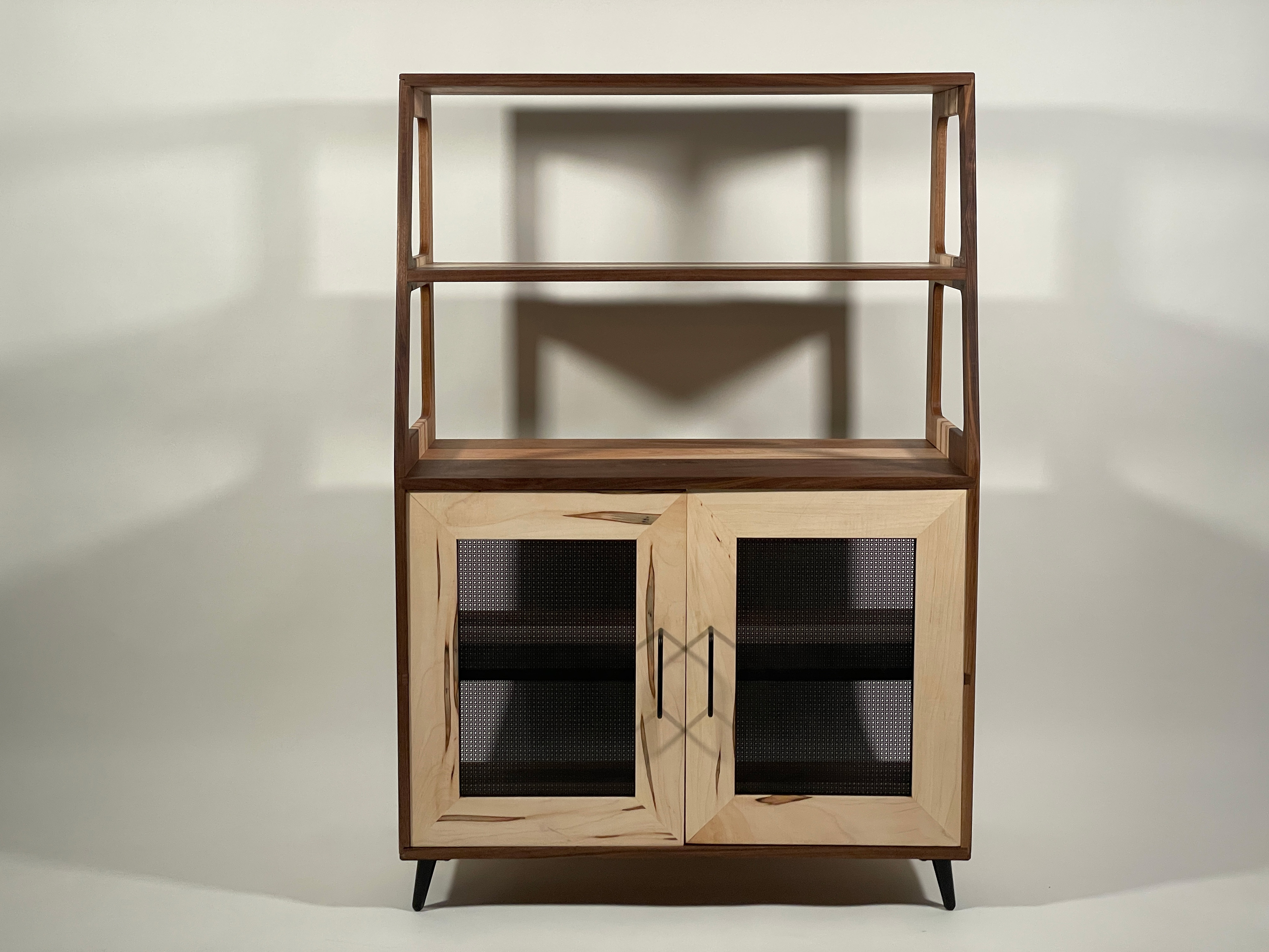 Started with the idea of making a tall walnut cabinet with a stripe of maple wood running through the middle and rattan screen doors. I acquired unmilled hardwood then joined & planed them to dimension. Next I glued up each shelf and side panel following the pattern. I put it all together and added doors with a metal screen.